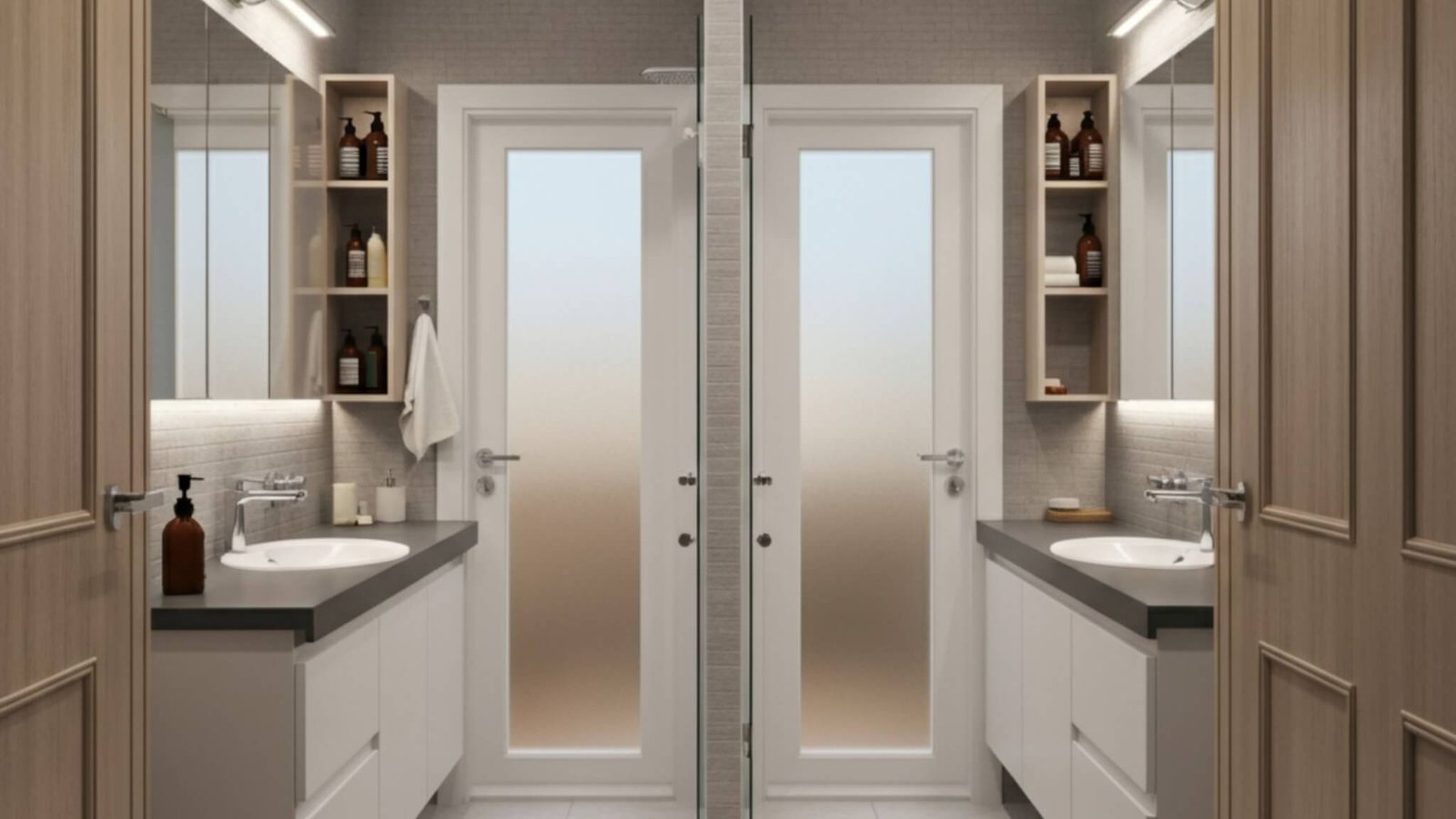 • Double Entry Doors: Two lockable doors serve the two rooms and are the only way to enter and exit the bathroom, enabling the occupants to move directly from their rooms to the bathroom while still being private. This setup is perfect for siblings, roommates, or shared spaces in family homes.